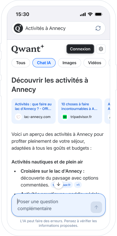 Depuis plus d’un an, Qwant expérimente en effet l’IA au service de la recherche avec la "Réponse Flash" : des synthèses rapides pour obtenir l’essentiel en un coup d’œil. Mais nos usages ont évolué et nous aurions exprimé un besoin clair : - Aller au-delà du résumé - Comprendre le contexte - Poser des questions complémentaires sans repartir de zéro Le Chat IA répond à cette attente. Il ne remplace pas les 10 liens bleus : il les complète, en ouvrant un nouvel espace d’exploration quand un sujet mérite d’être approfondi.