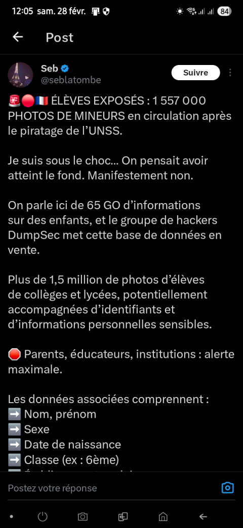 Malheureusement ce qui devait arriver, arriva ! C'est l'UNSS / Union Nationale du Sport Scolaire qui est aujourd'hui victime d'une fuite de données avec les photos de plus d'un million d'enfants ! Ces photos sont bien sûr associées à d'autres données : - Nom, prénom et sexe - Date de naissance - Établissement scolaire & Classe - Adresse complète - Assureur - Et surtout des liens directs non protégés vers les photos !