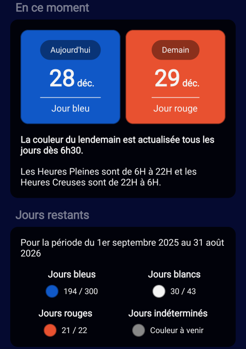 | Si vous êtes près de vos sous, ou tout simplement pas très riches, permettez-nous de vous rappeler l'existence du tarif EDF Tempo. C'est une offre tarifaire du fournisseur historique qui permet de faire de bonnes économies sur ses factures d'électricité, dans certaines situations. Si nous vous reparlons de ce tarif, c'est que demain sera le premier "jour rouge" de la saison, une information qui nous est donnée sur notre smartphone par différents moyens afin d'être certain de ne pas manquer cette information importante.