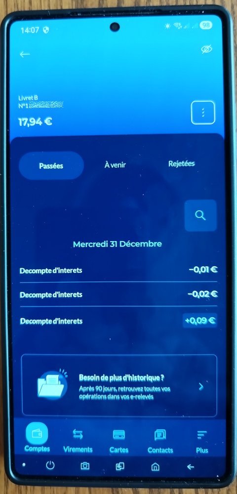 Si j'ai témoigné il y a quelques jours en critiquant bêtement la Banque Postale et la qualifiant de pire banque de France au niveau de ses outils numériques, j'ai pu profiter d'un moment de fonctionnement de leurs services pour vérifier combien mon Livret B m'avait rapporté cette année. Oui je sais un Livret B c'est nul, ça ne rapporte rien mais mon problème est qu'avec cette superbe banque, il m'est impossible de fermer facilement ce compte qui m'est inutile depuis de nombreuses années. Je ne peux même pas le vider complètement en espérant qu'il se ferme automatiquement tout seul à un moment. Bref je le garde car je n'ai pas envie de prendre un RDV avec une conseillère qui va me faire signer plein de formulaires, exiger une photocopie de ma carte d'identité, tenter de me refourguer 3 produits d'épargne, pour fermer un compte où il y a moins de 20 Euros depuis plus de 10 ans !