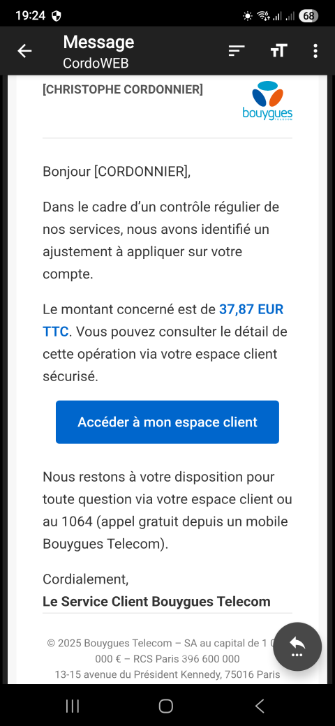Si comme nous vous êtes ou même avez été client Bouygues Télécom, sachez que ces données sont dorénavant utilisées par des personnes malveillantes qui espèrent vous arnaquer. Comment sommes-nous persuadés que ce sont les données de Bouygues qui sont utilisées ? Simple, pour certains services sensibles nous utilisons une adresse électronique unique. Venant de recevoir un message avec celle que nous utilisons uniquement pour Bouygues, retrouver la source de la fuite est simple et confirmé. Ce sont bien les données issues de chez Bouygues qui ont été utilisée dans le message illustrant ce petit article.