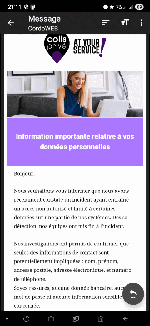Pourquoi cette réflexion ? Nous venons en effet recevoir une nouvelle fois, comme certains d'entre vous, un message nous avertissant que certaines de nos données personnelles ont été volées à des fins malveillantes. Pour une fois, ces données n'ont pas été volées, tout du moins en ce qui nous concerne, à une entreprise à laquelle nous les avons confiées, mais à une entreprise qui se les ait fait transmettre par une autre. En effet nous n'avons jamais fait directement appel à "Colis Privé", mais c'est cette entreprise qui nous alerte que des données nous concernant ont été volées. Si un livreur doit accéder à certaines de nos données, ce qui nous choque vraiment dans cette affaire, c'est que cette entreprise garde dans son système informatique nos données, même après la livraison effectuée. De quel droit garde t'elle ces données ?